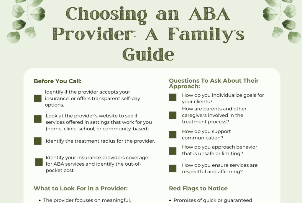 Choosing an ABA provider can feel overwhelming, especially when you’re navigating new diagnoses or supports. This free checklist helps families ask thoughtful questions, notice red flags, and feel more confident selecting services that aligns with their child’s needs and values.